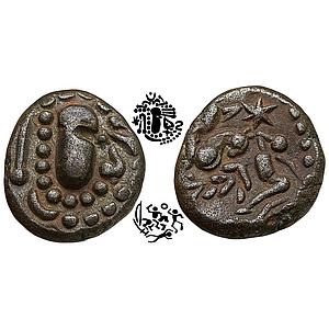 Hindu Medieval Paramaras of Malwa Gadhaiya Series Billon Unit Scene of battle field at night, a star above, A mounted warrior to right