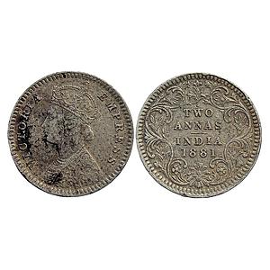 British India Victoria Empress 1881 AD Obv. B Rev. II C incuse Calcutta Mint Silver 2 Annas
