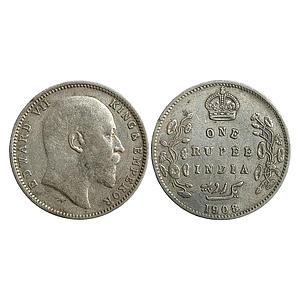 British India Edward VII 1908 AD Bombay Mint B incuse with dot on the vine and 8 over 7 in date Silver Rupee