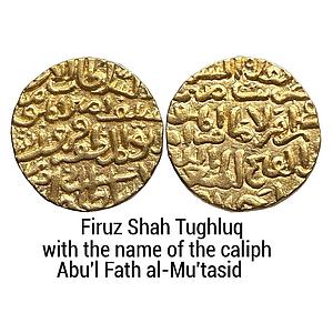 Delhi Sultan Firuz Shah Tughluq with the name of the caliph Abu'l Fath al-Mu'tasid Gold Tanka