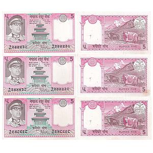 Nepal Birendra Bir Bikram Shah Signed by Kul Shekhar Sharma Set of 3 & 5 Rupees 5 NPR