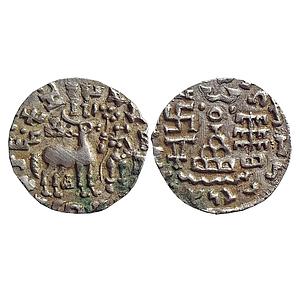 Ancient, Kunindas, Amoghabhuti, Three arched hill with parasol under Deer Type, Silver Drachma